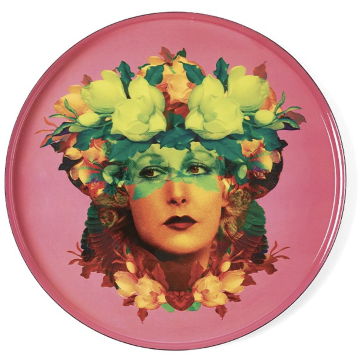 Le plateau rond Rosana de chez Gangzai est conçu en fer. Sur un fond orange soutenu, un motif surréaliste de buste de félin portant un chapeau à froufrou donne une touche insolite et graphique au plateau..