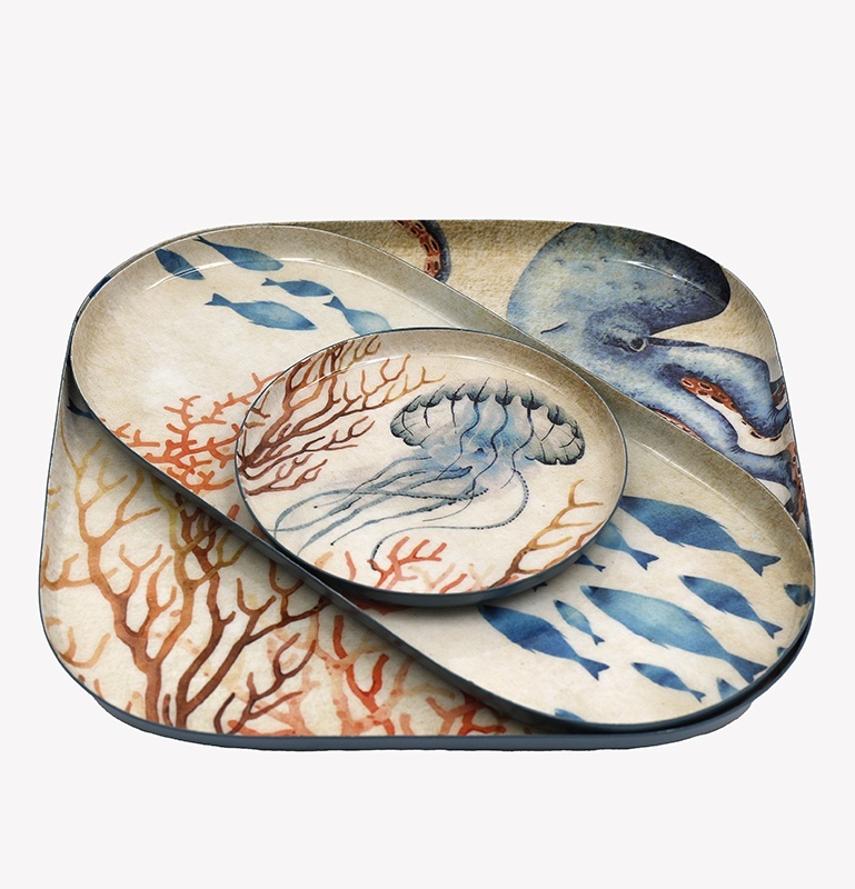 De la rencontre étonnante entre de motifs marins ( comme la méduse, la pieuvre, les algues...) et un matériau moderne, naît ces plateaux qui peuvent servir également de vide poche.