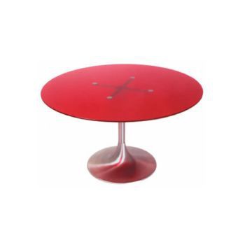 Table ronde conçue avec un plateau en verre laqué 10 mm sécurit. Pied en inox brossé diamètre 56 cm. Montage 4 vis.
