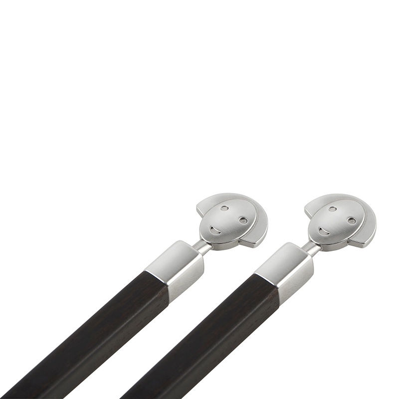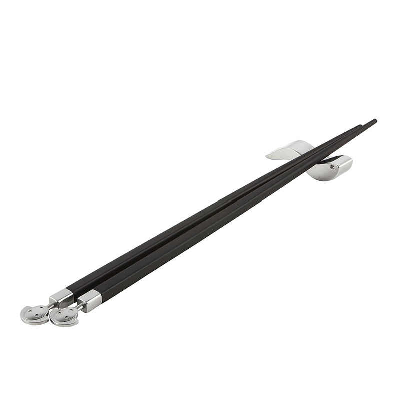 Ces baguettes en ébène noir profond offrent une prise en main agréable et une élégance naturelle, tandis que le support en acier poli assure une présentation parfaite sur la table. L’ensemble est sublimé par la silhouette stylisée d’Anna G, symbole de convivialité et de fantaisie.