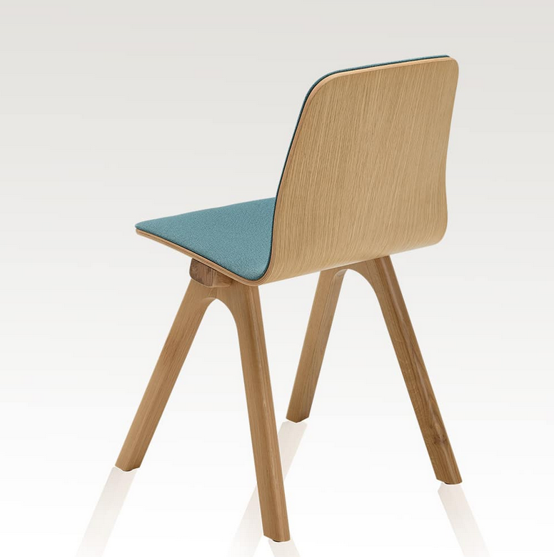 Matière : Structure en bois massif / Coque en multipli moulée plaquée chêne sur la face arrière / Placet en multipli 3mm recouvert d’une mousse MH40 de 20 mm tapissé d’un revêtement de votre choix.