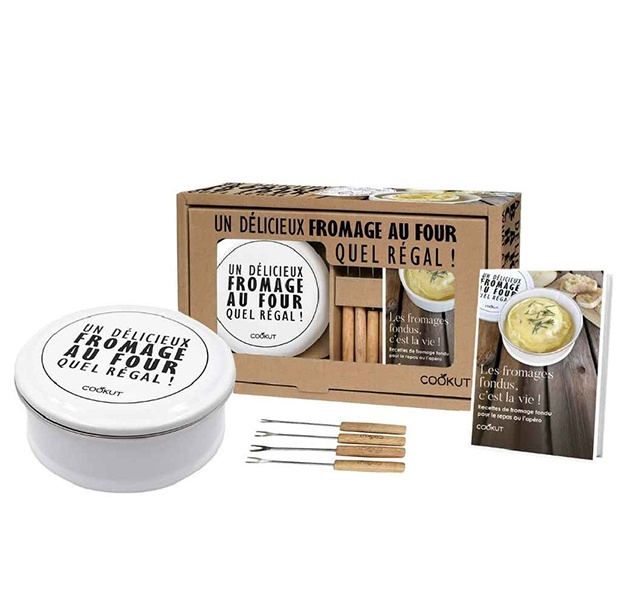 Le coffret fromage fondue au four de chez Cookut est conçu avec un cuiseur en acier émaillé, qui est parfait pour fondre des fromages facilement et proprement. il contient également Un livre de recettes de fromages fondu. Idée cadeau.