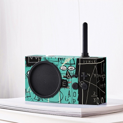 Le coffret Equals Pi de Jean-Michel Basquiat  chez Lexon X contient une enceinte Mino+, une lampe baladeuse Mina M, un réveil Flip+, et une radio Tykho3.