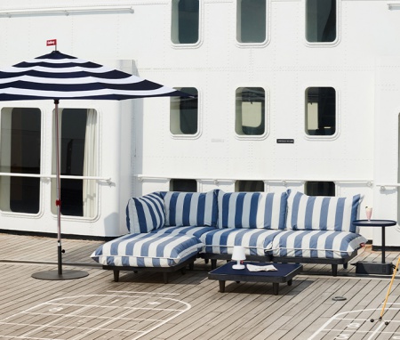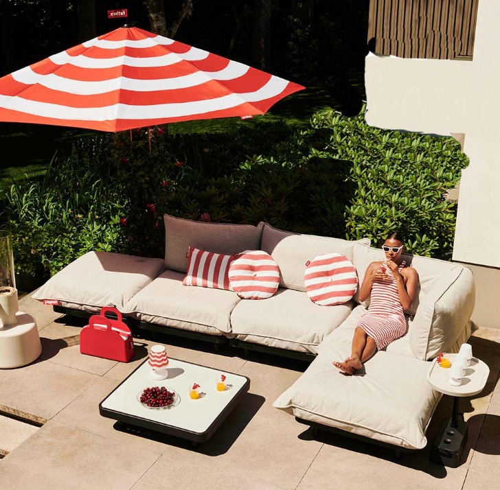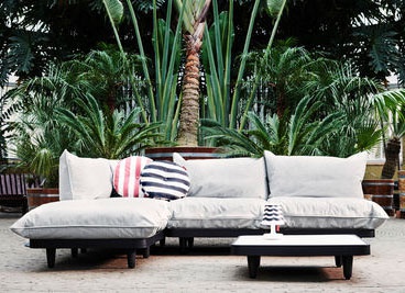 Le fauteuil / canapé "Paletti" de chez Fatboy dont la structure est en polyéthyulène recyclé et les coussins en mousse polyester recouvert d'un tissu Sunbrella.