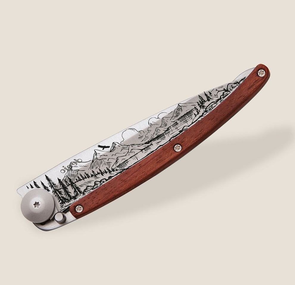 Le couteau “Montagne” de Deejo ne se limite pas au voyage physique : il évoque aussi le chemin intérieur. Sa lame délicatement décorée d’un paysage montagneux invite à la contemplation et à l’apaisement.