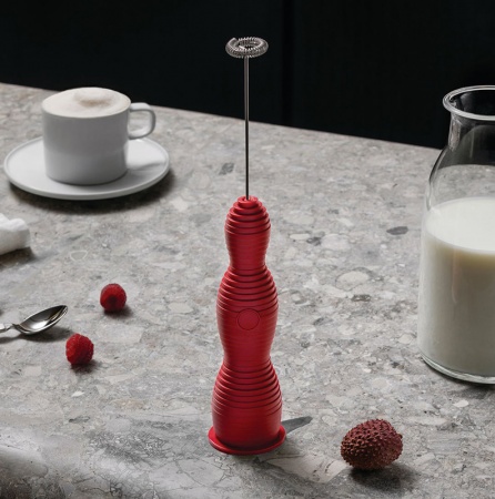 Le mousseur à lait Pulcina de chez Alessi est fabriqué en résine thermoplastique, le fouet est acier inoxydable et une batterie rechargeable.