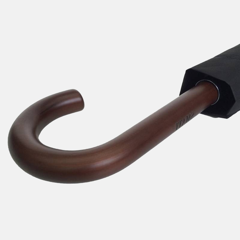 Ce long parapluie canne bois est muni de la traditionnelle poignée courbe en bois et du tape-à-terre. Pas surranné, il est anti-vent et il est équipé d'une ouverture automatique.
