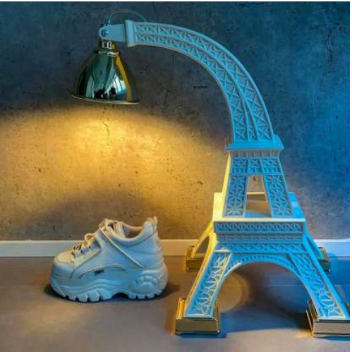 Ce projet présente une Tour Eiffel qui, en se pliant, devient la tige de support du diffuseur en laiton d'une lampe de sol ou de table. La base de la tour a quatre pieds qui soutiennent la structure.