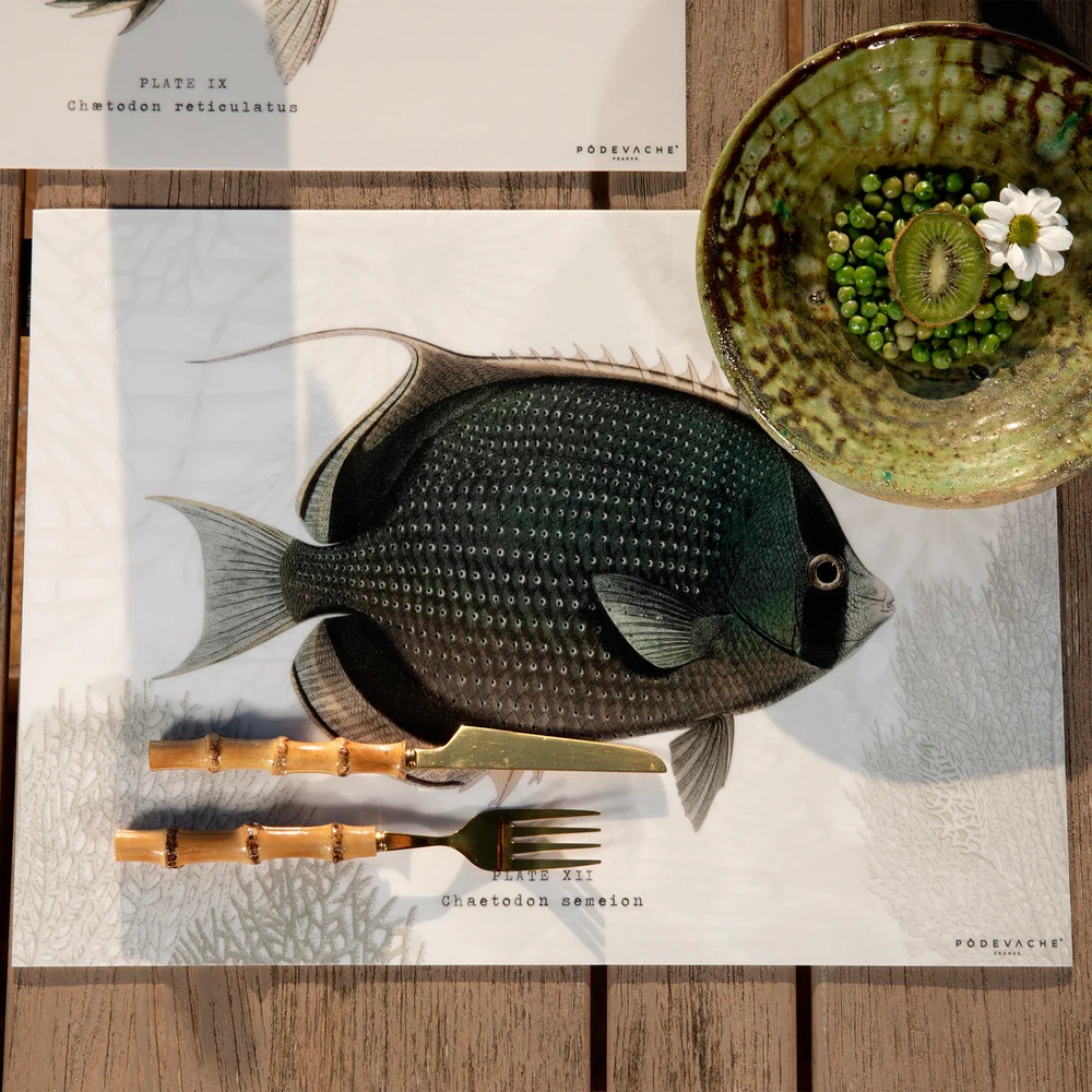 Le set de table *Lardier* de la marque française **Pôdevache** séduit par son style graphique et original. Imprimé d’un magnifique **poisson exotique sur fond blanc**, il insuffle une atmosphère à la fois chic et dépaysante à votre table. Réalisé avec soin dans des matériaux durables, il allie **esthétique et praticité**. Parfait pour sublimer un repas, mais aussi pour détourner son usage : il devient un **vide-poche élégant** ou un support pour ranger vos bijoux avec style.