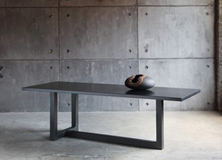 Matériaux : Structure démontable avec pieds en tube d'acier carré 8 x 8 cm et plateau épaisseur 4 cm en tôle d'acier naturel pliée