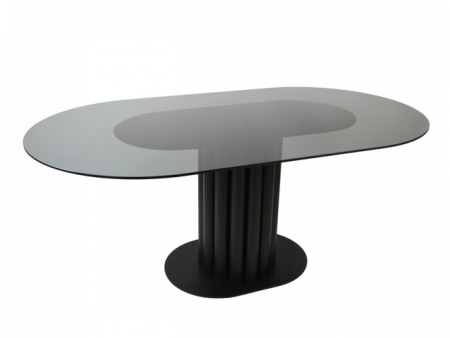 La table Octave est idéale pour recevoir confortablement 6 convives. Le plateau en verre fumé permet de distinguer son piètement en cannelure de tube métal, lui conférant toute son élégance.