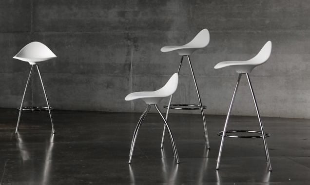 Pied en métal chromé ou mat. Assise en polypropylène blanc.