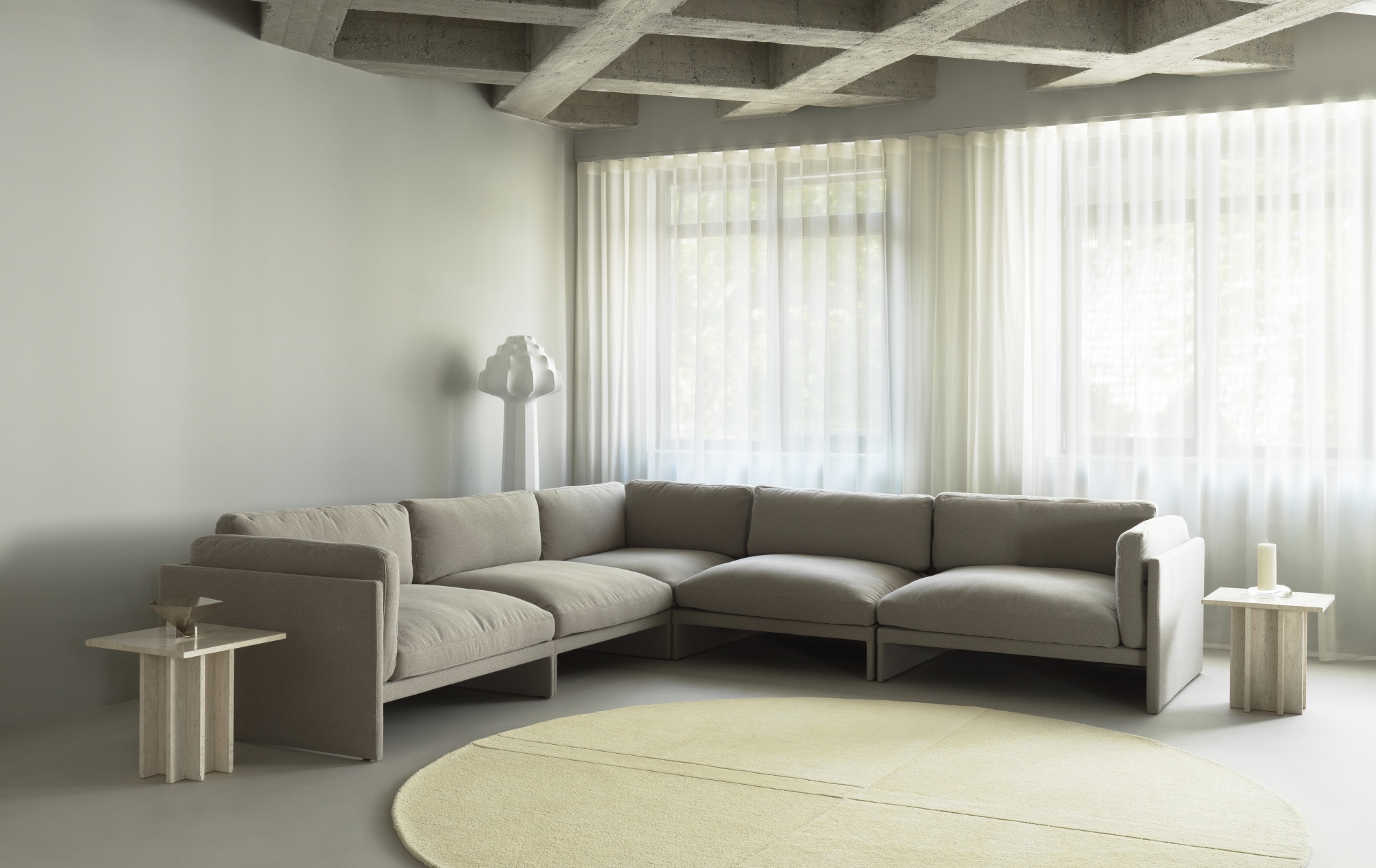 Level Rug est touffu à la main à partir de 100% de laine, connue pour sa durabilité, sa douceur et sa chaleur. Comme son nom l'indique, Level est un tapis minimaliste mais complexe qui présente une surface délibérément inégale obtenue à travers des hauteurs de pieux variables, créant un effet contrastant. Level Rug est disponible en trois tailles rectangulaires et rondes et en deux couleurs contemporaines de jaune clair ou de gris chaud.