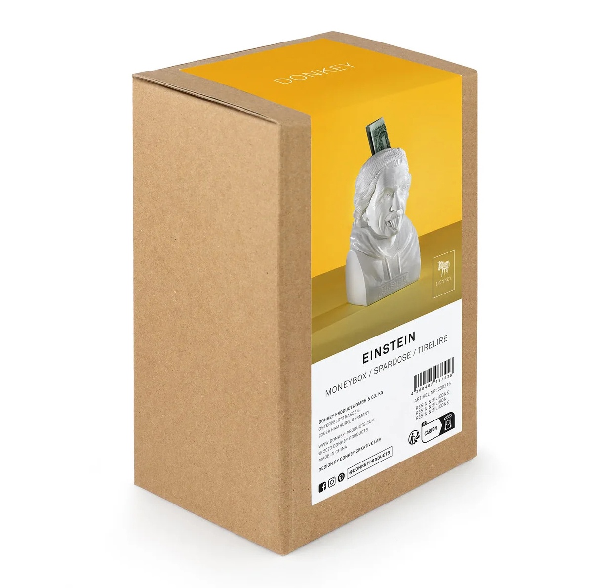Sculpteur du quotidien, Donkey revisite la figure d’Einstein pour en faire une pièce déco à la fois moderne et pleine de caractère. Cette tirelire, réalisée en polyrésine de qualité, s’impose comme un élément design dans n’importe quelle pièce : bureau, bibliothèque ou salon. Son allure sculpturale attire l’œil tandis que sa fonction vous invite à économiser simplement, presque naturellement. L’équilibre parfait entre esthétique, humour et fonctionnalité. Un objet qui raconte une histoire et qui apporte une touche arty à votre intérieur.