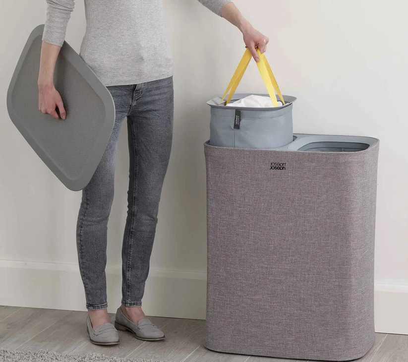 Le bac a linge  " Tota " de chez Joseph Joseph est conçu avec deux compartiments de 30 litres pour une séparation facile des matières textiles