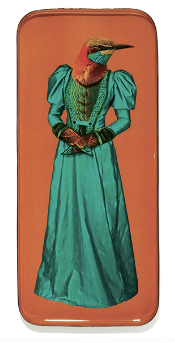 Avec Prima Donna, Gangzai transforme un simple plateau en véritable œuvre décorative. Conçu en fer embouti, ce vide-poche rectangulaire séduit par son fond orange vibrant et son illustration singulière : une femme surréaliste à tête et corps d’oiseau, élégamment vêtue d’une robe de soirée verte.
