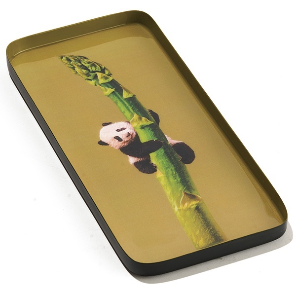 Conçu en fer embouti, il séduit par son format rectangulaire pratique et son univers visuel audacieux : sur un fond vert kaki profond, des asperges stylisées s’élancent tandis qu’un panda espiègle y grimpe avec légèreté. Le contraste entre nature graphique et touche décalée crée un objet déco à forte personnalité.